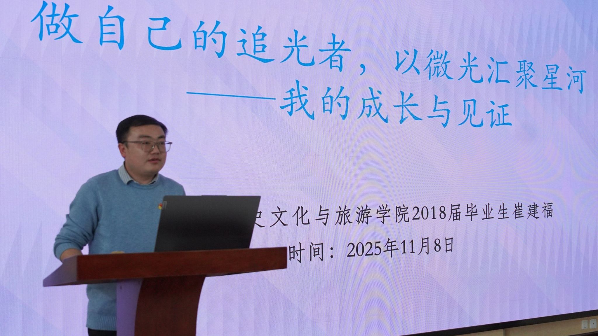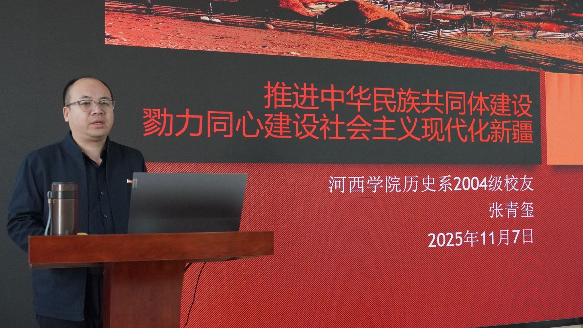 报告会邀请了历史学专业2008届毕业生张青玺与2018届毕业生崔建福两位优秀校友。张青玺以“推进中华民族共同体建设,勠力同心建设社会主义现代化新疆”为题,介绍了新疆深厚的历史文化渊源、经济发展现状、教育水平、发展机遇、工作环境以及招商引资和就业政策,描绘了一幅充满活力与希望的新疆图景。崔建福以“做自己的追光者,以微光汇聚星河”为题,结合自身的学习与工作经历,分享了选择新疆的机缘、个人的心路历程以及职业成长路径,他以亲身经历勉励在场同学珍惜大学时光,扎实学好专业知识,全面提升综合素质,并尽早进行科学的职业规划。