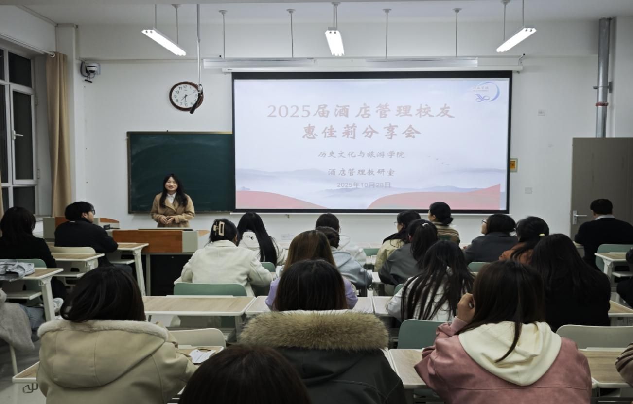 为提高学生对专业的认同度,增加对酒店行业了解和认识,学院于2025年10月28日下午在十教201举行优秀校友报告会。本次活动邀请了2025届酒店管理校友惠佳莉,惠佳莉同学于2025年7月成功入职锦江集团管培生职位。旅游管理、酒店管理和会展经济与管理80多名师生参加本会活动。