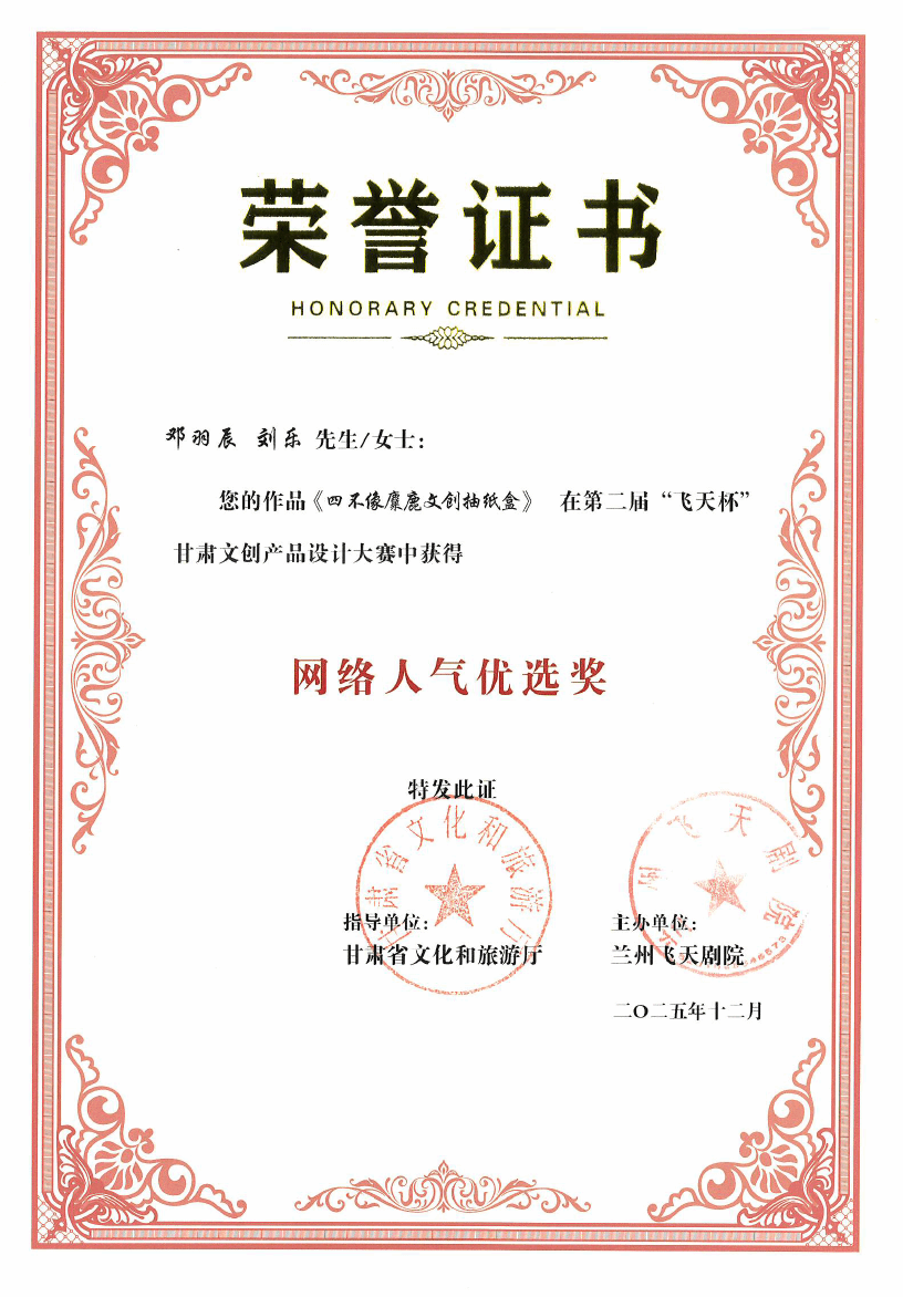 本届大赛于2025年10月10日启动作品征集,12月10日截稿,聚焦甘肃文旅资源的创新转化,参赛作品涵盖文旅创意、非遗活化、时尚设计、数字文创等多个类别。历史文化与旅游学院旅游管理专业硕士研究生邓羽辰、博物馆专业硕士研究生刘乐,在指导老师崔云胜、赵宏亮的悉心指导下携手创作的作品《四不像麋鹿文创抽纸盒》,从全国1452件参赛作品中脱颖而出。在累计超20万次的人气投票中拔得头筹,斩获网络人气优选奖。两位同学发挥跨专业互补优势,以文旅交融为创作核心,将旅游管理专业的市场洞察与博物馆专业的文化底蕴深度融合,凭借对甘肃本土文化的精妙诠释,收获了网友的广泛青睐与支持。